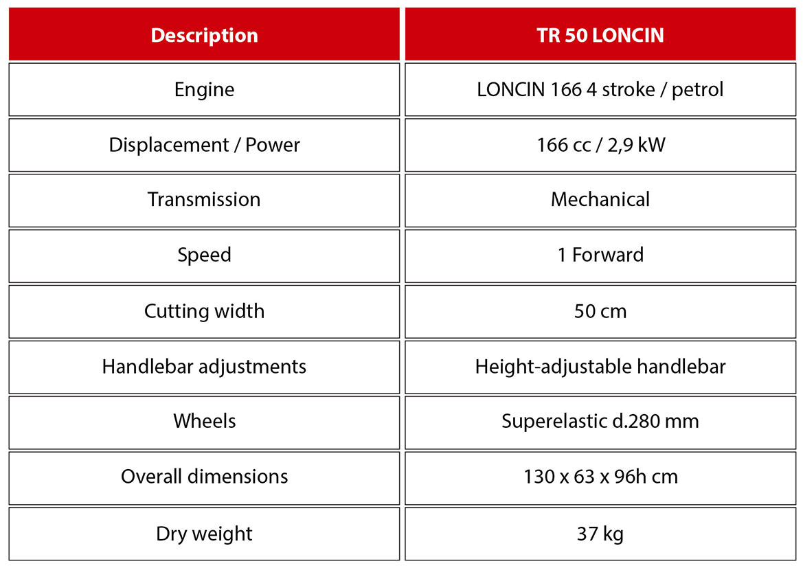 Il decespugliatore a ruote TR 50 è la macchina ideale per la pulizia del vostro giardino, lavorando in modo efficiente ed ergonomico. Il Decespugliatore TR 50 ha una larghezza di taglio di 50 cm, agevola e velocizza le operazioni di pulizia di erba su superfici come aree verdi, giardini, parchi e per la pulizia di bordi e zone ove i normali rasaerba non possono accedervi. La sua conformazione compatta e leggera lo rende accessibile anche negli spazi ristretti e la sua testina di taglio “decentrata” rispetto alla carreggiata, consente una pulizia dei bordi più accurata. È la macchina alternativa ai decespugliatori classici portatili, disponendo però di più potenza e larghezza di taglio e non da meno, lavorando con più comfort essendo semovente su ruote da 280 mm di diametro. È equipaggiata con un potente motore a benzina 4T e di una trasmissione meccanica monomarcia per avanzare anche su terreni leggermente sconnessi senza difficoltà. La testina di taglio può ospitare 2 fili doppi di nylon fino a 5 mm di diametro max per una migliore efficacia di taglio. Tutto ciò si traduce in efficienza di lavoro in modo sicuro ed ergonomico!